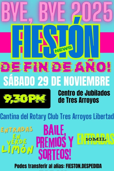 El cierre del año se celebra a lo grande y en la ciudad ya comienza a sentirse la energía de un evento que promete convocar a vecinos y vecinas en una noche llena de color, música y diversión. Bajo el nombre “Fiestón News – Bye, Bye 2025”, la fiesta se llevará adelante el sábado 29 de noviembre a las 21:30, en el Centro de Jubilados de Tres Arroyos.